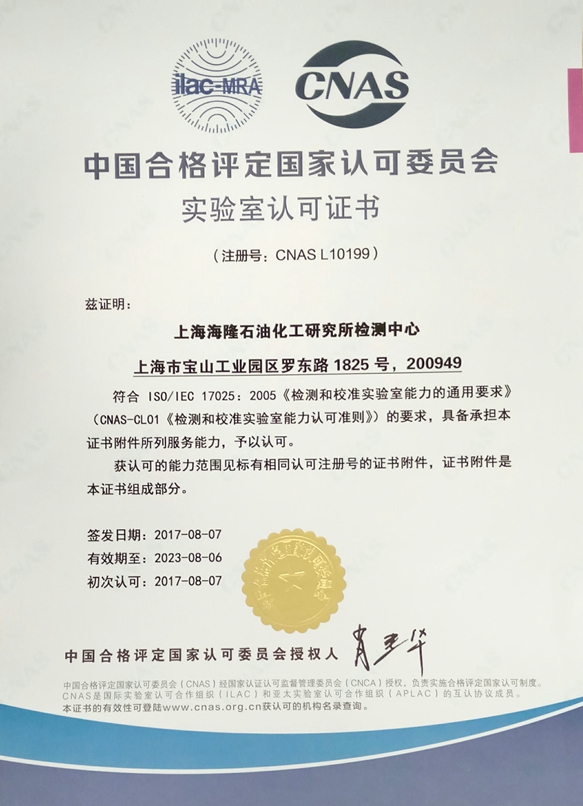 (2017年9月11日,上海)上海海隆石油化工研究所順利通過中國合格評定國家認可委員會(CNAS)現場評審,于近日正式獲得CNAS認可資格證書(注冊號:CNAS L10199)。該證書的獲得表明化工研究所已建立了比較完善的管理體系,能夠滿足《檢測和校準實驗室能力認可準則》的要求;同時標志著化工研究所出具的報告,具備了在全球53個國家和地區相互承認的資格.