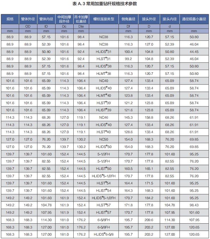 常用加重鉆桿規格請見表 A.3 。